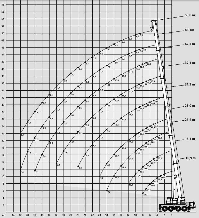 Univerzální autojeřáb klasické konstrukce s 50 m dlouhým výložníkem, který může přesunout břemena až do maximální váhy 80 tun. V určitých případech lze vysouvat výložník se zavěšeným břemenem.
